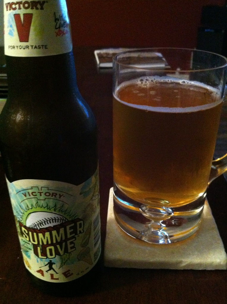 Victory was one of my gateway beers into the craft brewery scene, so I see it fitting for me to kick this site off with their Summer Love Ale. A college friend (and employee of Victory at the time and now owner of Marshall Brewing Company in Oklahoma) brought about 5 cases of various Victory beers to an alumni tail gate to watch our Tulsa football team take on Navy in Annapolis. At the time I really considered beers like Guiness, Sam Adams Boston Lager, and Stella Atois to be unique and those only drank by true beer connoisseurs. Therefore this new range of India Pale Ales, Belgiums, etc was a whole other level to drinking and enjoying beer. To get to the point, the Bud Light and Miller took a back seat to Golden Monkey, Hop Devil, and Prima Pils. 5-6 years later they continue to take a back seat as I find myself enjoying the Victory summer release on hot summer day in 2012.